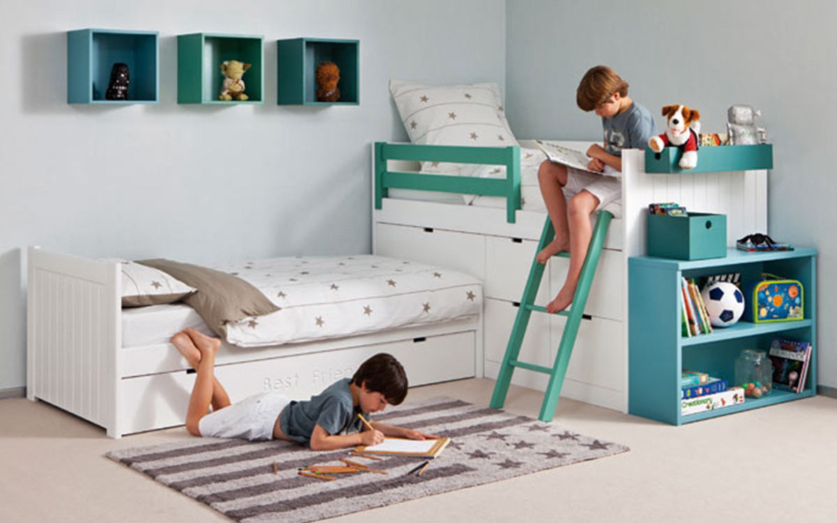 Original propuesta de Asoral para habitación infantil pequeña, compuesta por cama block y cama nido (90×100) acoplada a su lateral. En el criterio de elección de cualquier habitación se deben tener en cuenta la distribución, funcionalidad y la estética. En este caso la distribución aprovecha al máximo el espacio al estar colocado en ángulo y posibilitar el aprovechamiento de las zonas inferiores de las camas para almacenamiento o para incluir un somier extraíble. La calidad del mueble está fuera de dudas al tratarse Asoral de una firma que trabaja con madera de haya maciza en su estructura y acabado final texturado, lo que le da una resistencia fuera de serie. Compruébelo en nuestras tiendas de Madrid.