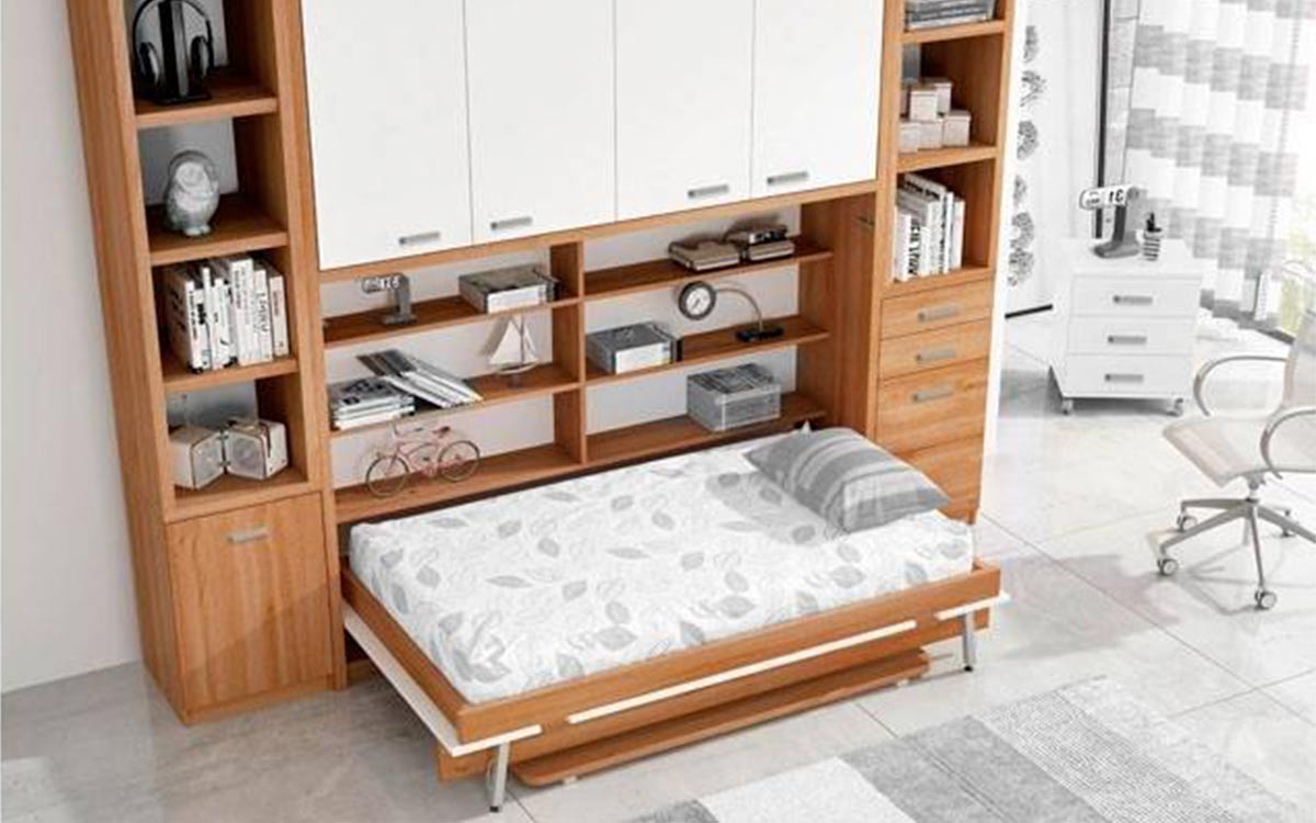 - Mueble cama de 120 x 190 con somier independiente de lamas de madera y colchón normal de hasta 20 cm de grueso.