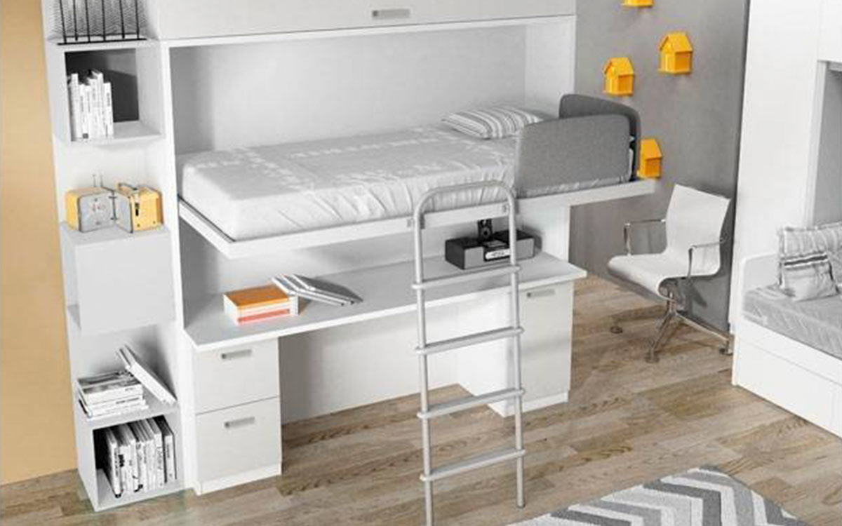 Cama abatible horizontal elevada con gran mesa de estudio debajo