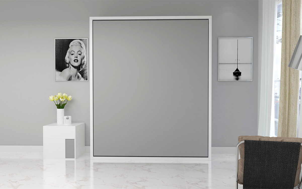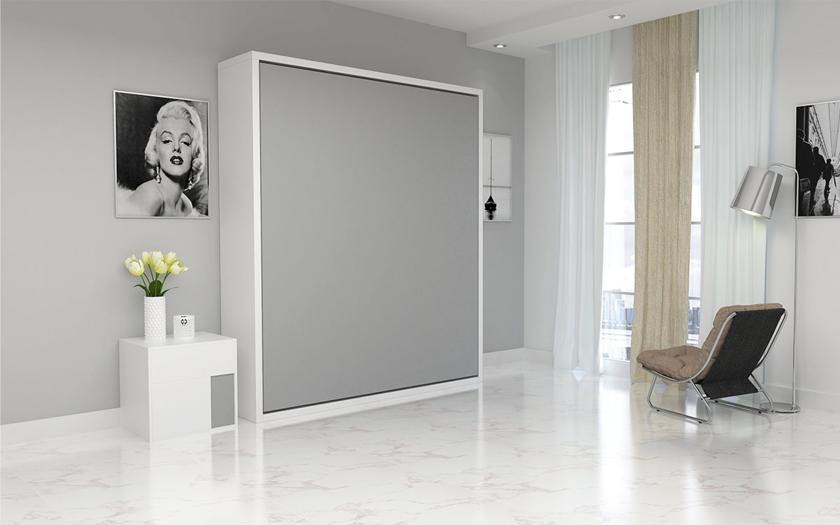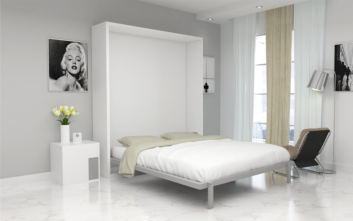 El inmejorable acabado lacado de esta cama abatible, junto con su linealidad, se integra perfectamente en el salón o en el cuarto de estar.