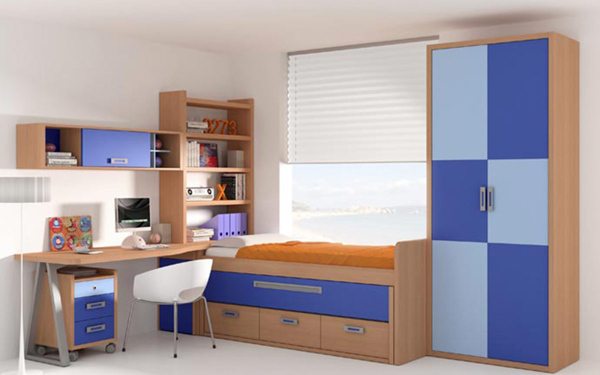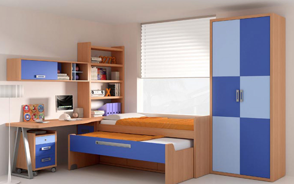 Propuesta de dormitorio juvenil en ángulo compuesta por cama nido elevada con somier inferior y cajoneras para almacenamiento. El espacio de la cabecera se ha aprovechado para alargar el escritorio y añadir una librería, ideal para guardar cajas o libros. El conjunto se completa con un armario a los pies de la cama y un módulo de almacenaje en la parte superior del escritorio. Los acabados en chapa sintética permiten una fácil limpieza y mantenimiento. Consulte opciones en nuestras tiendas de Madrid.