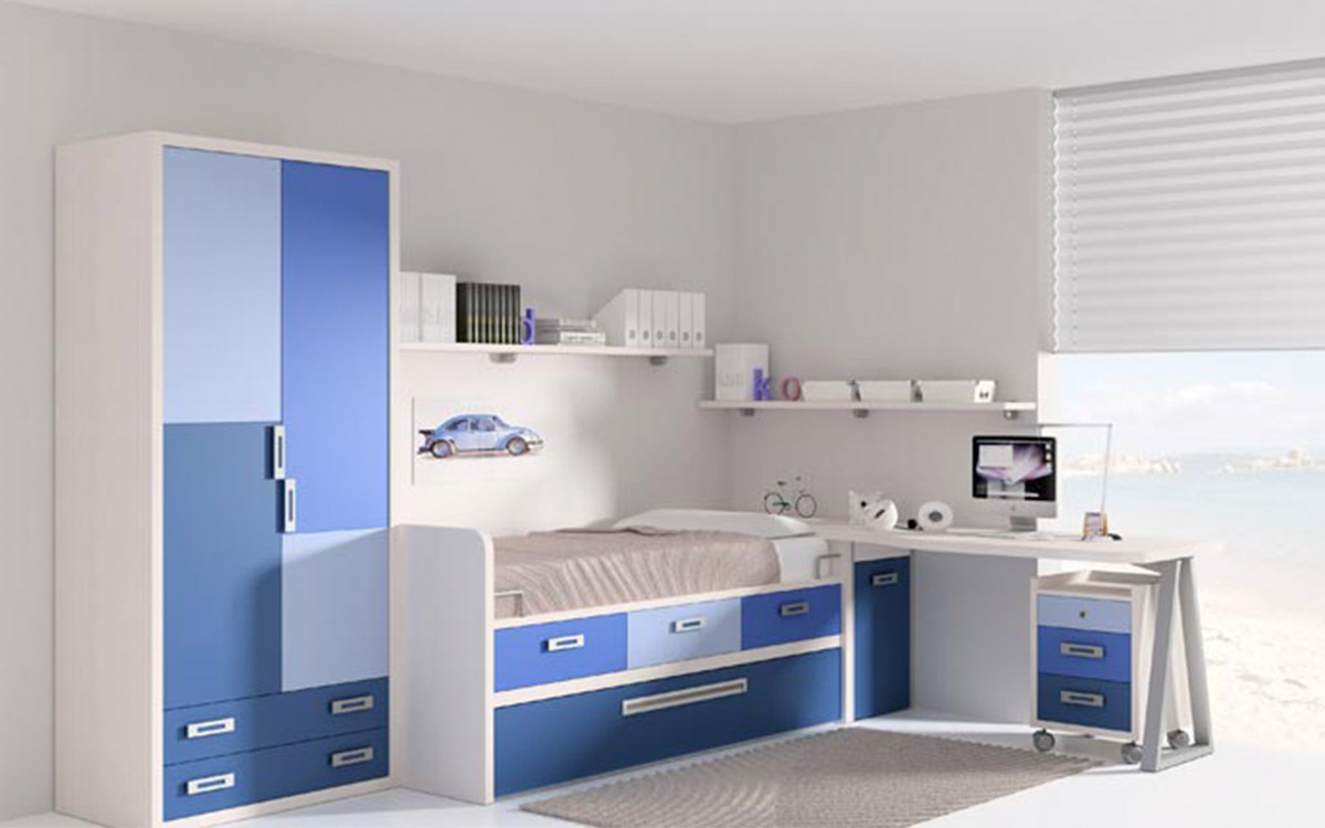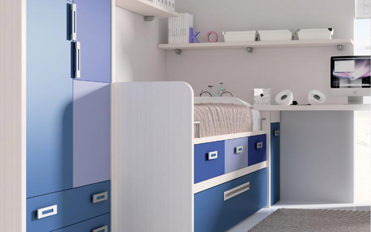 Los muebles acabados en chapa sintética son muy indicados para niños por su dureza e inocuidad. Además, como en este caso, se pueden hacer a medida, con múltiples combinaciones y unos costes muy reducidos. Esta cama nido dispone de 3 cajones inferiores y un espacio debajo que se puede aprovechar tanto para colocar un somier extraíble como una cajonera extra para ganar un espacio de almacenamiento. Hay multitud de tiradores que permiten personalizar aún más el diseño. Compruebe todas las posibilidades en nuestras tiendas de Madrid.