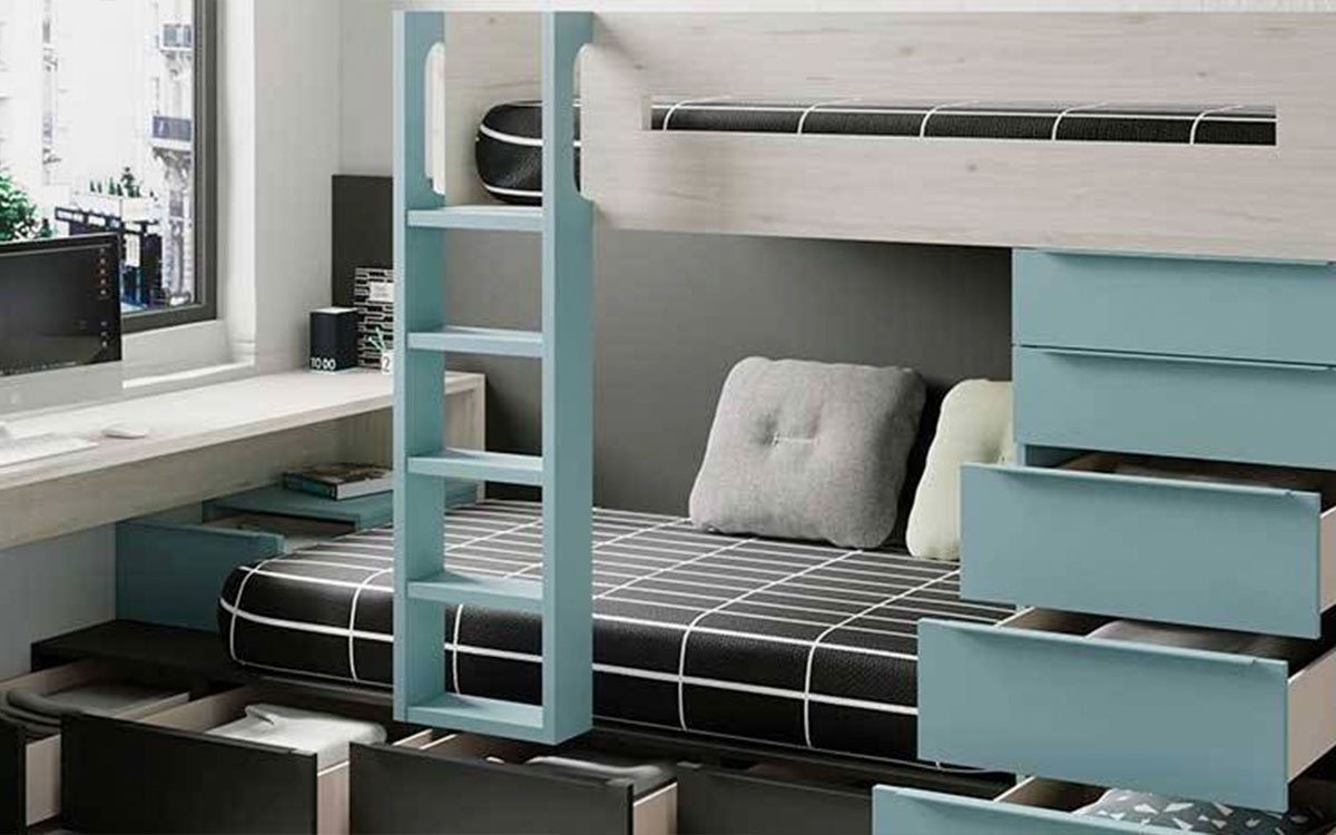 Las literas tren son una solución perfecta para habitaciones compartidas, ya que ahorran espacio y, en este caso, y gracias a la composición, permiten añadir espacios extra de almacenamiento ( cajones y grandes gavetas para objetos voluminosos) en las partes inferiores y en los laterales. La chapa sintética les da un plus de durabilidad y practicidad, ya que es fácil de limpiar y resistente. Compruebe que propuesta se ajusta más a sus necesidades en nuestras tiendas de Madrid.